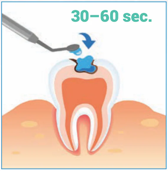 Apply gel to the caries-damaged tooth and allow to sit for 30–60 seconds.Appliquer le gel sur la dent cariée et laisser agir pendant 30 à 60 secondes.