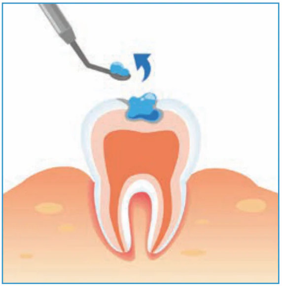 Tap area to determine if damaged dentin is soft enough to gently scoop out, and scoop out as required.Taper légèrement la zone pour vérifier si la dentine endommagée est suffisamment ramollie pour être facilement enlevée à l’aide d’une curette. Enlever délicatement la dentine ramollie si nécessaire.